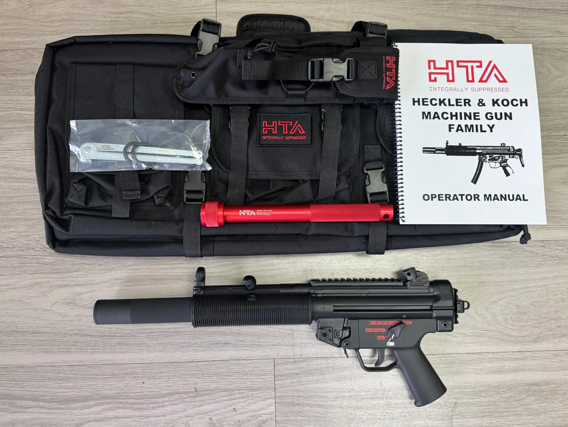 In 1974 H&K initiated design work on a sound-suppressed variant of the MP5, designated the MP5SD (SD—Schalldämpfer German for “sound suppressor”), The HK MP5SD features an integral but detachable aluminum sound suppressor and a lightweight bolt. The weapon’s 146 mm (5.75 in) barrel has 30 2.5 mm (0.1 in) ports drilled forward of the chamber through which escaping gases are diverted to the surrounding sealed tubular casing that is screwed onto threading on the barrel’s external surface just prior to the ported segment. The suppressor itself is divided into two stages; the initial segment surrounding the ported barrel serves as an expansion chamber for the propellant gases, reducing gas pressure to slow down the acceleration of the projectile. The second, decompression stage occupies the remaining length of the suppressor tube and contains aluminum baffles with several compartments which increase the gas volume and decrease its temperature, deflecting the gases as they exit the muzzle, so muffling the exit report.